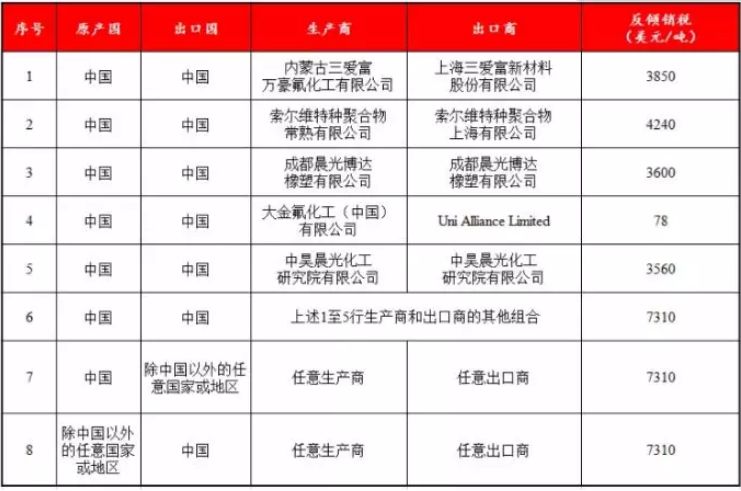 但据知情人表示,印度工商部仍对我国的氟橡胶征收着反倾销税,税额在78~7310美元/吨之间,征税期为自2018年12月27日起的18个月,反倾销税率详情如下。