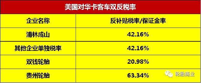 美国商务部经过2016年~2017年的反倾销和反补贴调查,确定浦林成山、双钱轮胎及贵州轮胎等百余家中国卡客车轮胎生产及出口企业的倾销幅度为9%~22.57%。其中,贵州轮胎的补贴率为63.34%,双钱轮胎的补贴率20.98%,其他企业的补贴率为42.16%。